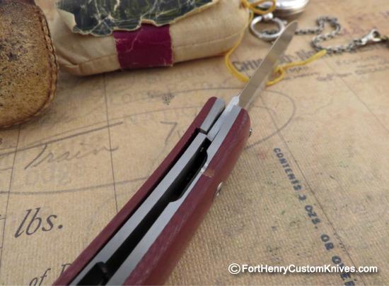 The D2 Blade opens smoothly and the blade has more than enough Cutting Edge to tackle any Every Day Chore and outdoor Field & Stream tasks as well. Bob milled out a small section of the Micarta handle to allow for easy access to the RH Thumbstud.