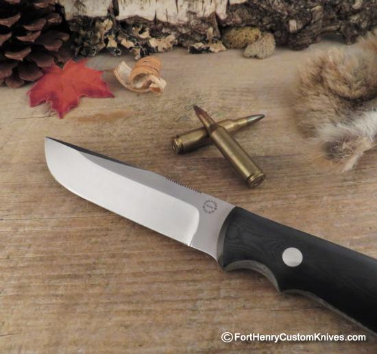 This Dozier Wilderness is a big, Rugged Blade ~ .200 thick D2 steel with a Full Tang. This beauty will be a cutting, chopping machine ~ able to tackle any task on any size game! Thick Black Micarta handles have excellent Hand Filling Contours, Stainless blind bolts and Stainless lined Thong hole.