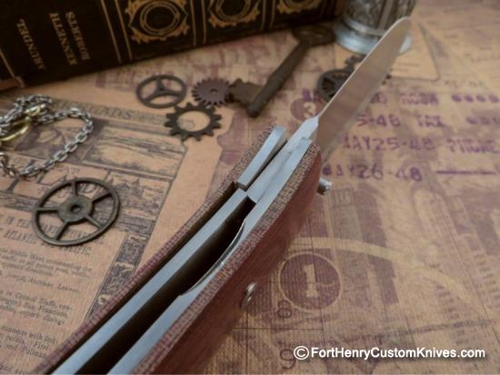 Bob isn’t making many Folding knives days, so I was extremely glad to recently receive this Classic Dozier Folding Hunter with unique Natural Canvas Micarta handle scales that were cut on the Bias to show the Grain.