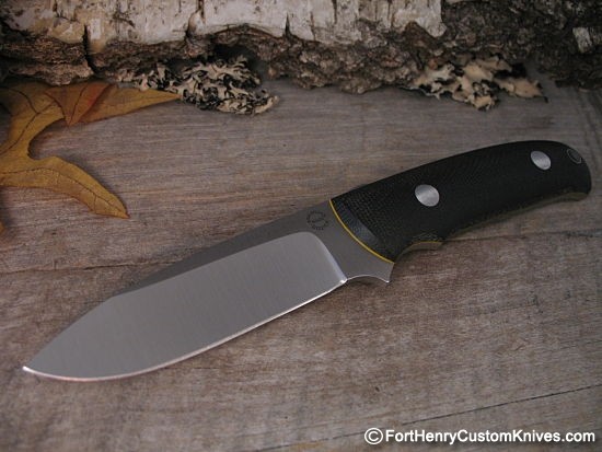 Handles scales were left full and the Birds’ Beak type rear end make this a nice hand filling and secure feeling knife. Black linen Micarta handles with Yellow Liners, Stainless blind bolts and a Stainless lined Thong hole.
