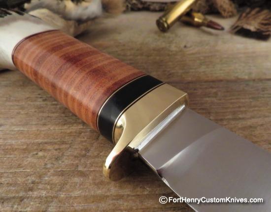 In Bob’s Classic line, the hidden tang is a Full One-Half Inch wide and is completely Heat-Treated to gain the maximum properties that can be had from the steel. A rectangular slot is machined in the handle to perfectly fit the tang. This eliminates the need to fill up the extra space with epoxy. Then just the necessary amount of epoxy, along with a brass nut secure the handle for a lifetime of hard use.