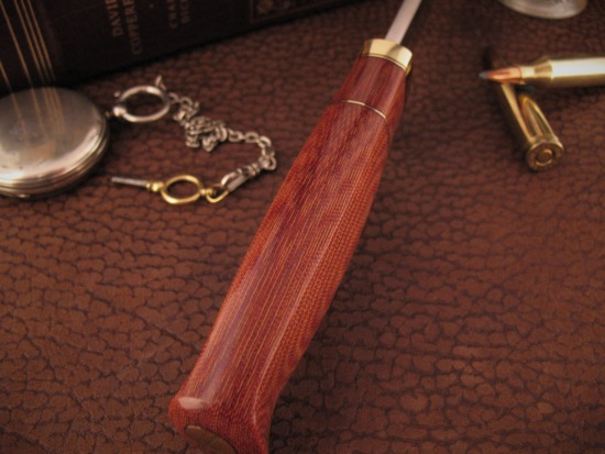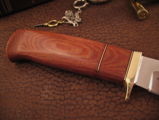 This knife has a handle of tough Natural Canvas Micarta (which has a nice swell and Birds Beak style Butt) with Brass and Burgandy G-10 Spacers. The Brass Guard is Silver Soldered so no moisture has access to inside the handle.
