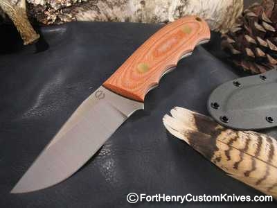 Great ergonomics in the finger grooved handle, nice contours for a sure grip. Wonderful clip point blade, Natural / Tan Micarta handles, Black liners. Brass blind bolts and a Brass lined Thong hole.