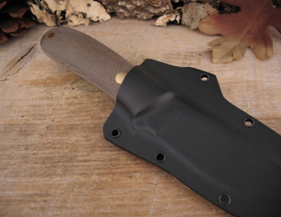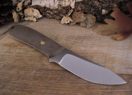 The Handle Scales are Tough Green Canvas Micarta with a Belt Satin Finsh. Full Tang with wonderful balance, Brass Blind Bolt and Brass Lined Thong hole.