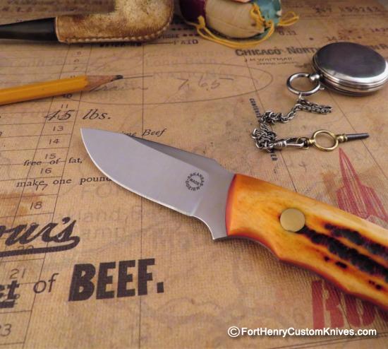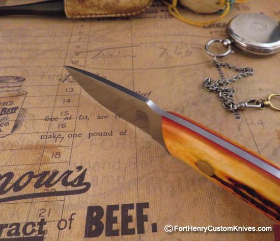 I ordered this knife from Bob well over a year ago. This is Great Looking Modified Personal Utility with Amber Jigged Bone Handles