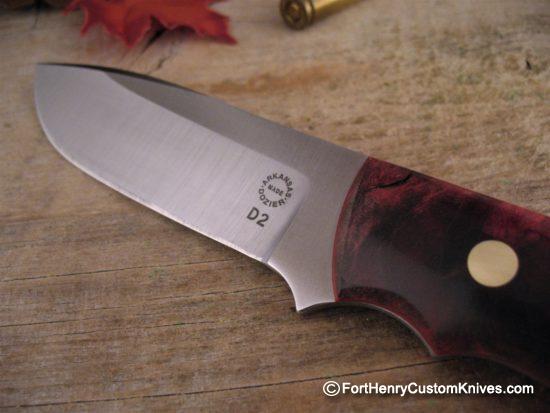 A Larger woods blade, useful for all manner of Camp Chores and Large Game Skinning. The D2 Steel Blade has a near Full Height Hollow Grind with a Long Custom Swedge and Custom Thumb Ridges ~ it is .135 Thick and has an approximate Rockwell of 61.