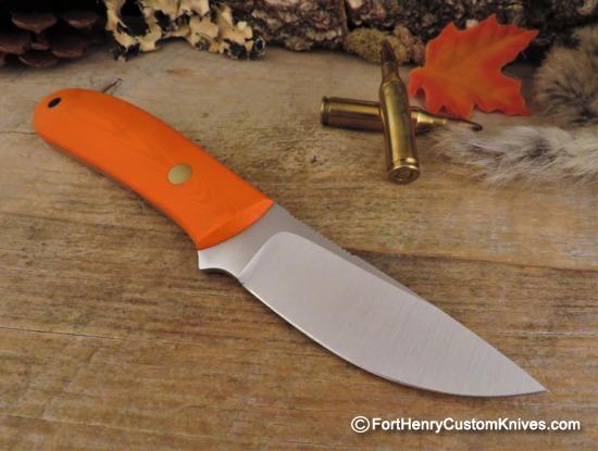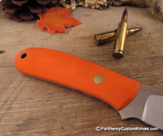 A great hunting or skinning knife. A Tough Full Tang Design with a very comfortable Full Grip Hunters Orange G-10 handle with complimenting Brass blind bolt and a Brass lined Thong hole.
