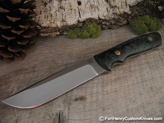 Brass blind bolts and Brass Lined Thong hole. Hair shaving sharp (as expected) and comes in Bob’s RH Vertical Wilderness Kydex Sheath.