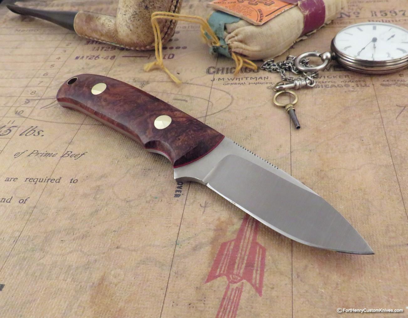 This Loveless Style Drop Point Blade has a Very High Hollow Grind plus a set of Gorgeous Bolivian Rosewood Burl handle scales with Brass Blind Bolts.