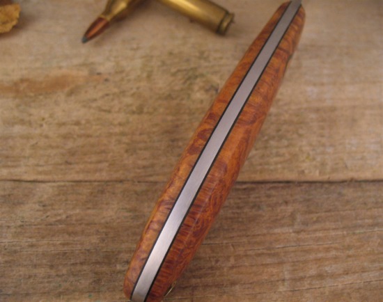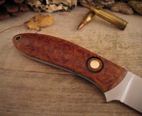 Check out the Amazing Color and Grain of the Exhibition Grade Maple Burl handle scales. The handle has a nice Integral Forward Finger Guard with a Gently Sloping Rear – greatly increases the comfort and stability of the grip.