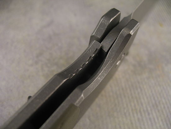 The Framelock side scale has a Acid washed/Stone Washed finish which blends very well with the two tone finish of the blade.
