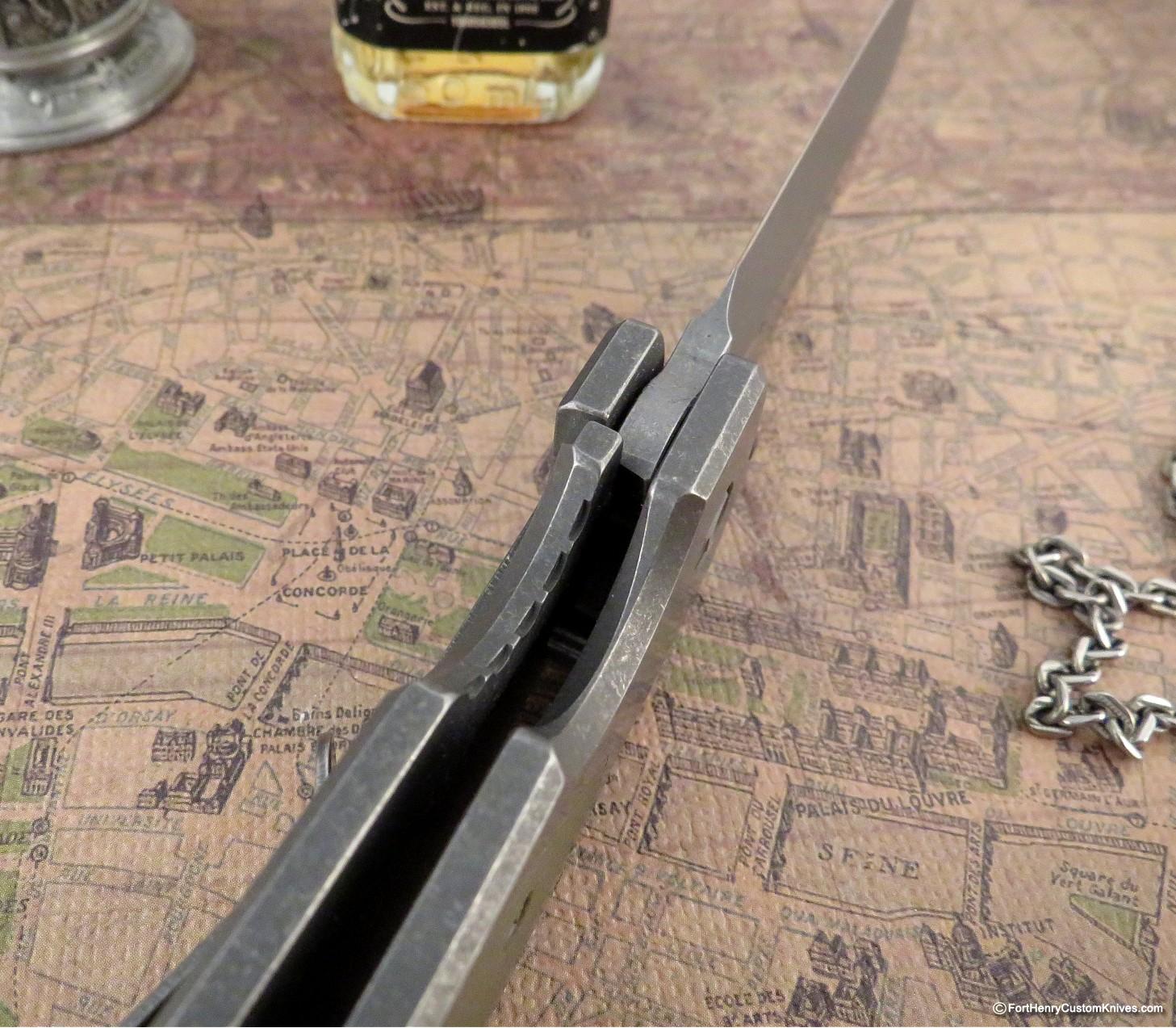 The Framelock side scale has a matching Stonewash finish which blends very well with the half Stonewash finish of the blade.