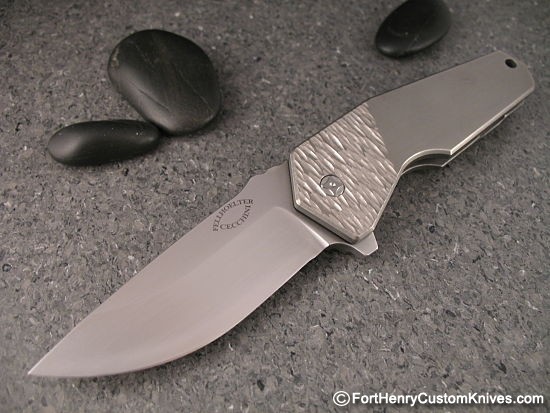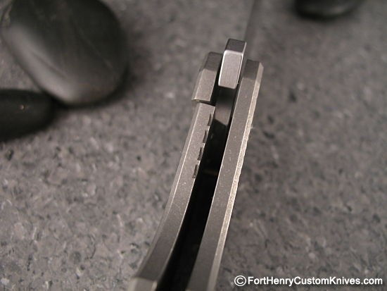 Custom Thumb Ridges and striking Faux Bolster effect on the Stonewashed Titanium Handle Scales.  The thick Titanium scales have been given a very comfortable Diamond Chip texture that adds a nice bit of traction when holding the knife.