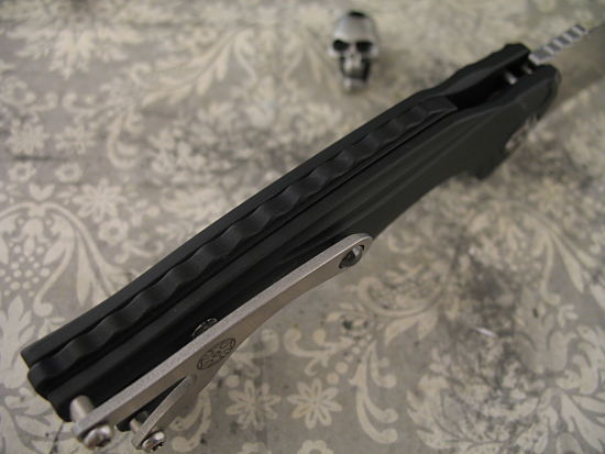 The Aluminum frame has some comfortable Sculpting in the center to enhance the grip. The Thumb Ridges on the Spine of the blade really enhance the security of the knife when open.