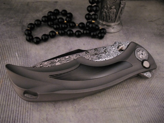 This is Brian Tighe’s Newest Integral to hit the Knife scene – the Tighe Down! This Tighe Down Integral has an Incredible Textured Zirconium Inlay along with a Custom Damasteel Pivot Collar and clip – a Button lock Flipper design with a beautiful Damasteel Blade that has a Complicated Duplex Grind!