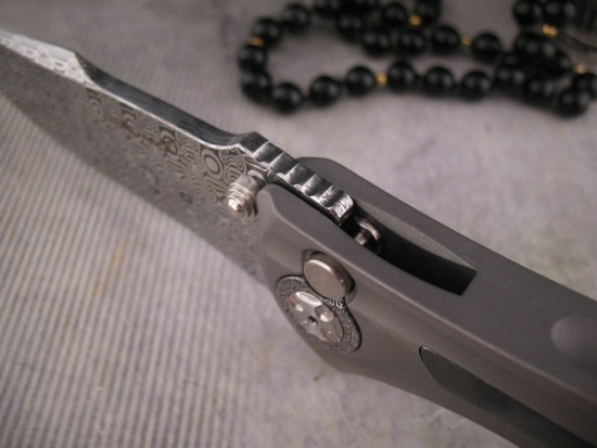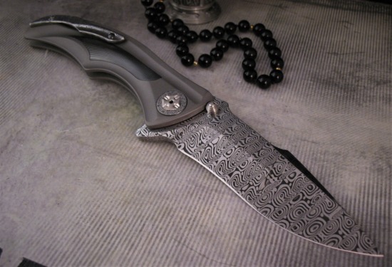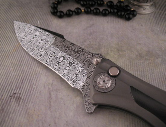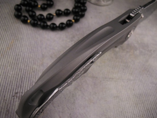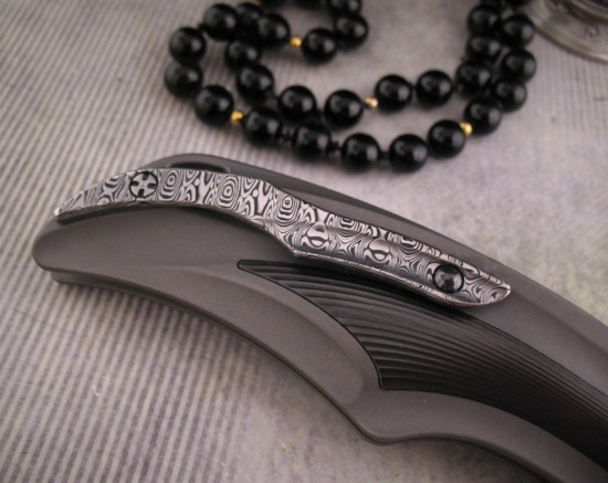 The Artistic Deep Set Custom Damasteel Pocket clip has a Polished Ceramic Ball at the Tip for smooth movement in and out of the pocket. The Low Rider clip allows this knife to ride out of sight!