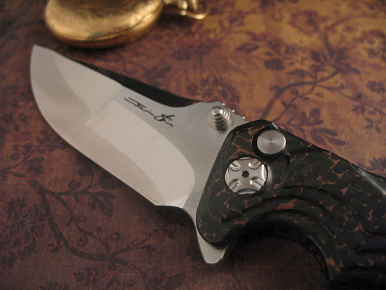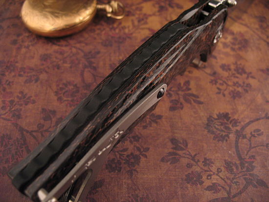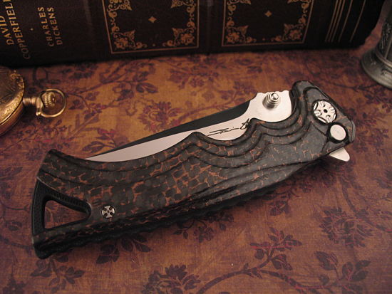 The Amazing San Mai blade is CPM154 with a S90V core and was Double Ground by Brian – it Flips open with impeccable smoothness, a super smooth action due to Brian’s Needle Thrust Bearing system.