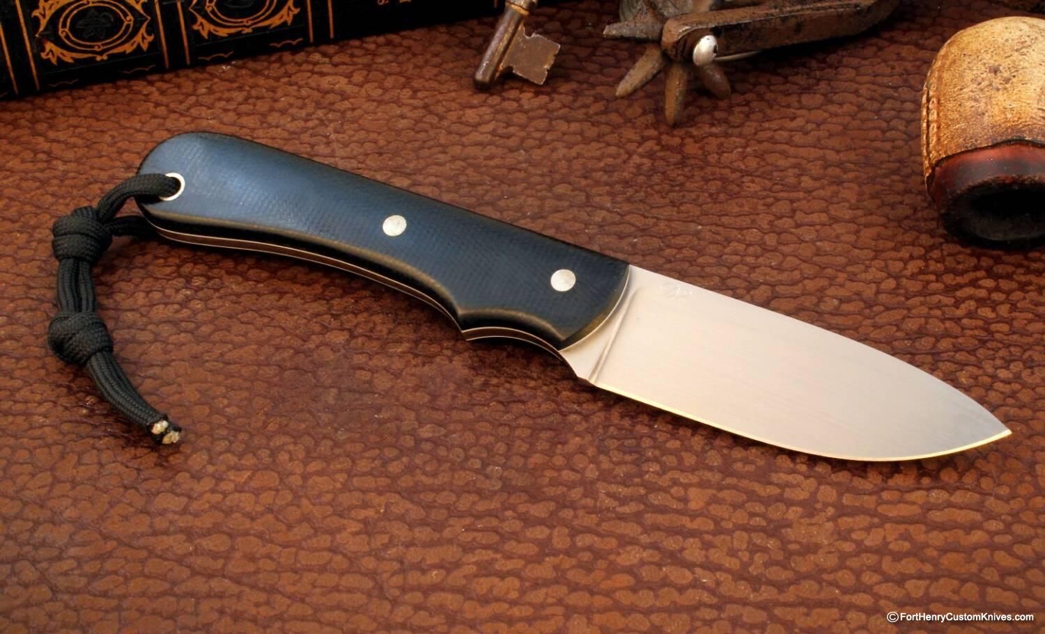 This example has Polished Canvas Micarta with wonderful grain, along with subtle White Liners and Stainless Pins to accent the handle material. The Generous Integral Front Guard makes for a very secure and comfortable Full sized Grip.