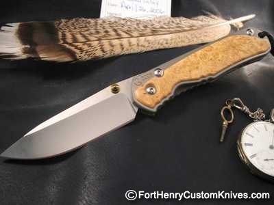 This particular Sebenza is a Vintage Large Right Hand carry, has gorgeous stabilized Box Elder Burl covering the front scale which blends very nicely with the small inlay i nthe rear of the knife. Gold Anodized Lug and Spacers and Polished Blade.