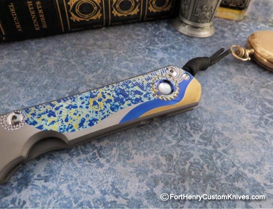 This is Chris Reeve’s Large Sebenza 31 with a Unique Graphic and Mother of Pearl Cabochon