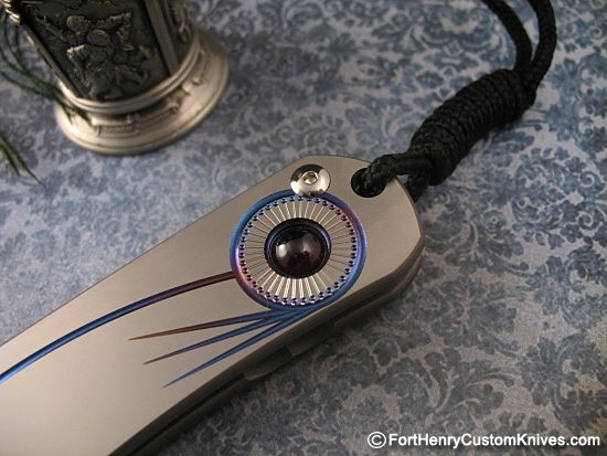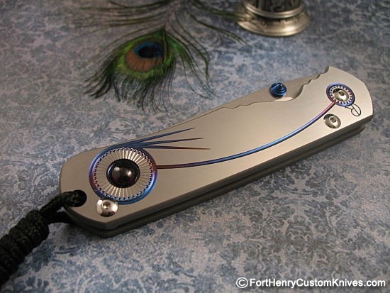 It has an amazing multi color Unique Graphic on the front scale. Nearly the full range of Anodized colors available. The S30V blade has a High Polish and the RH Thumbstud and all Ti Spacers are anodized a matching Blue.
