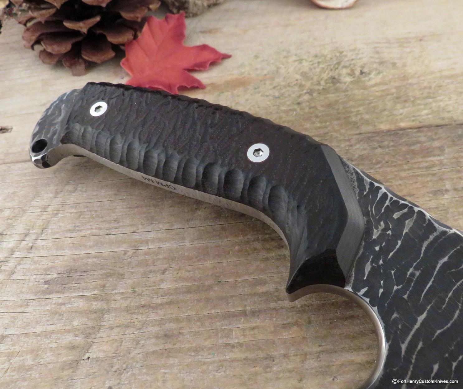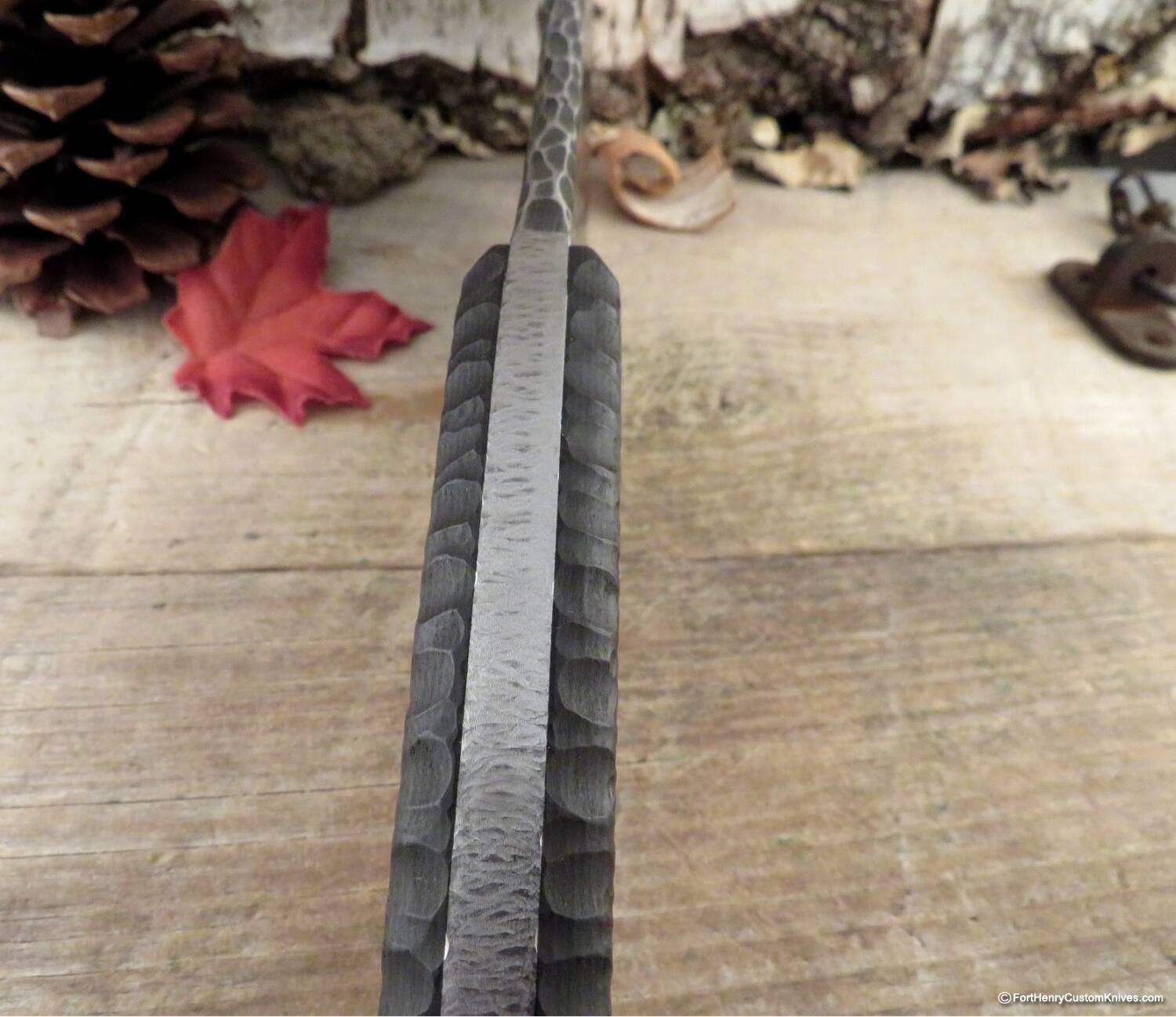 The Custom Full Tang / Full Size Handle Shape melts into your Palm. It has a Dramatic Birds Beak butt and Deep Forward Finger Guard, these combine to make an Extremely Secure and Comfortable Grip. The Generous Choil at the Rear of the Blade allows for a Close Grip for tighter work.