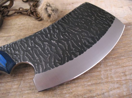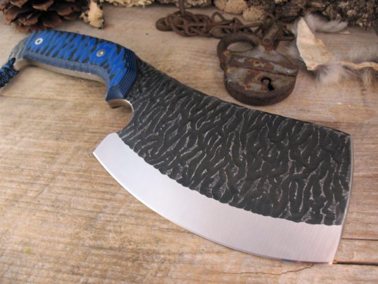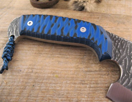 Full Tang and Thick Blue & Black G-10 handle scales have a Three Dimensional Carving and Perimeter Traction Grooves to channel Dirt and Moisture away from the middle of the handle. This will provide a sure grip even under other than ideal conditions.