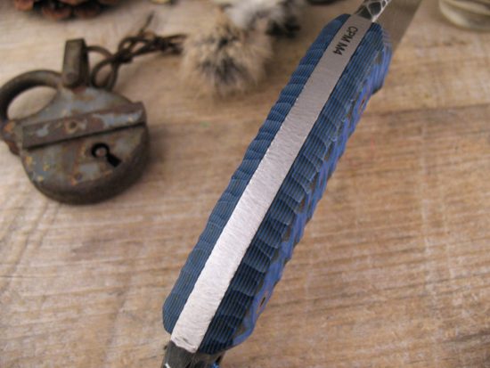 The CPM M4 Blade has an RC of approx 63 and an Abstract Textured / Heat Treated Finish and the Spine has a Unique Hand Applied Flint Napped texture.