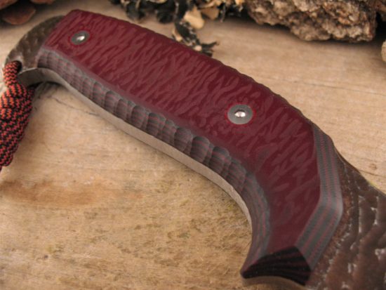 Full Tang and Thick Red & Black G-10 handle scales have a Three Dimensional Carving and Perimeter Traction Grooves to channel Dirt and Moisture away from the middle of the handle. This will provide a sure grip even under other than ideal conditions.