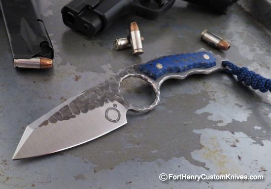 This is a Tough, Full Grip / Full Tang Design, slightly more than 1/8″ Thick (.150) ~ Hand Ground from High End Crucible CPM 3V Steel. The handle scales have a Custom Perimeter Texture ~ due to the Extended Butt this knife is Secure and Comfortable in both the Forward and Reverse Positions.