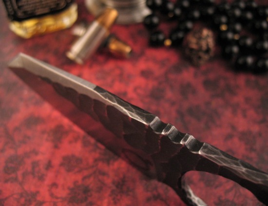 This is a Tough, Full Grip / Full Tang Design, slightly more than 1/8″ Thick (.150) ~ Hand Ground from High End Crucible CPM 3V Steel. Traction Ridges on the Butt and on the Spine.