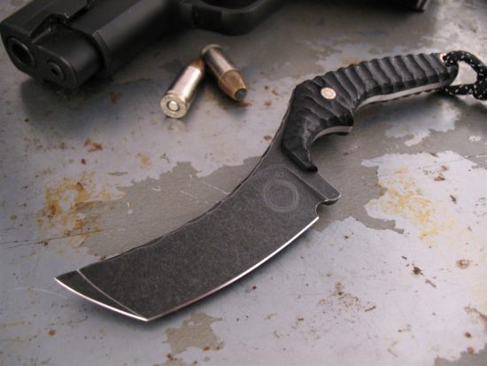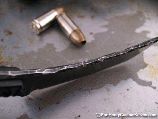 The Custom Sized Handle and Shape melts into your Palm. Slightly more than a Three Finger grip it has a slim feel and the Thumb falls naturally onto the Spine where the Flint Knapping texture does Double Duty as Thumb Ridges for added Security.