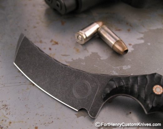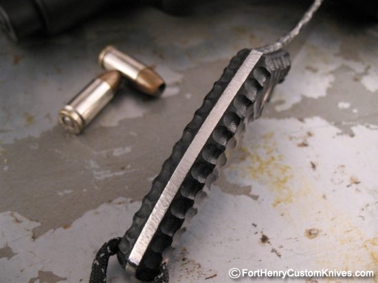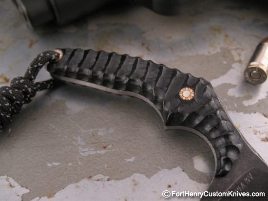 Thick G-10 handle scales with Custom Texture Traction Ridges around the Perimeter. This will provide a sure grip even under other than ideal conditions. A Cool Upgrade that Cobble has applied to this Example is a Mosaic Lanyard Pin Hole!