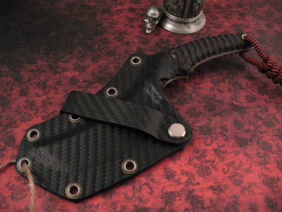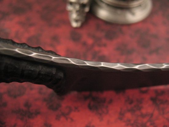 The Blade has a Dark Stonewashed Finish and the Spine has a Unique Hand Applied Flint Napped texture.