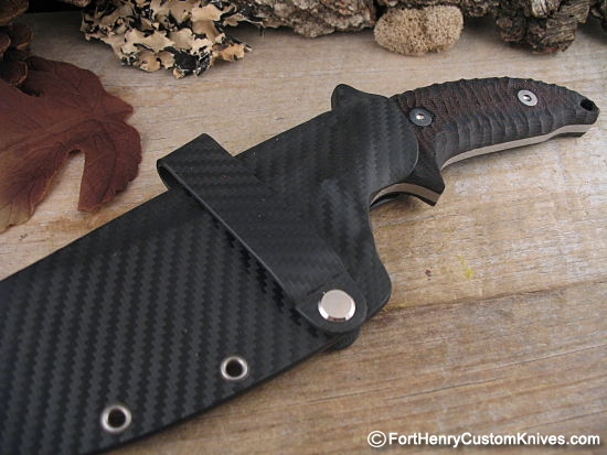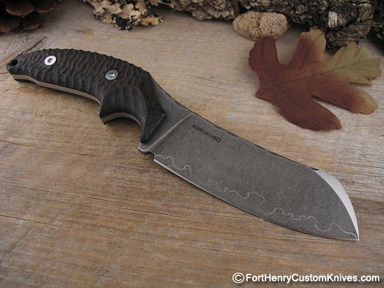 The Blade has a Dark Stonewashed Finish and the Spine has a Unique Hand Applied Flint Napped texture. Professional Heat Treat provides a very respectable 61 on the Rockwell chart.