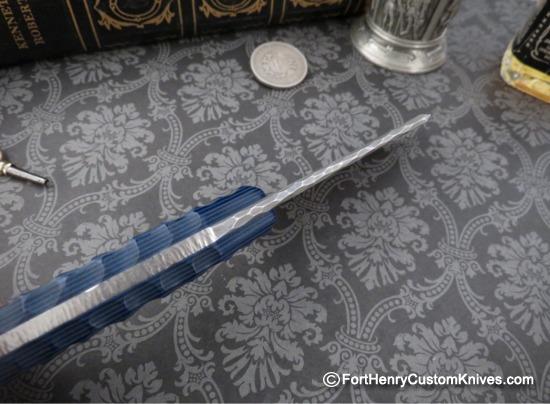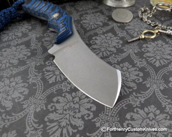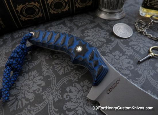 Thick Blue & Black G-10 handle scales with Custom Texture with Traction Ridges around the Perimeter. This will provide a sure grip even under other than ideal conditions. The Custom Sized Handle and Shape melts into your Palm and as with most Cobble Blades, this one has a Glow in The Dark Center inside the Mosaic Pin!