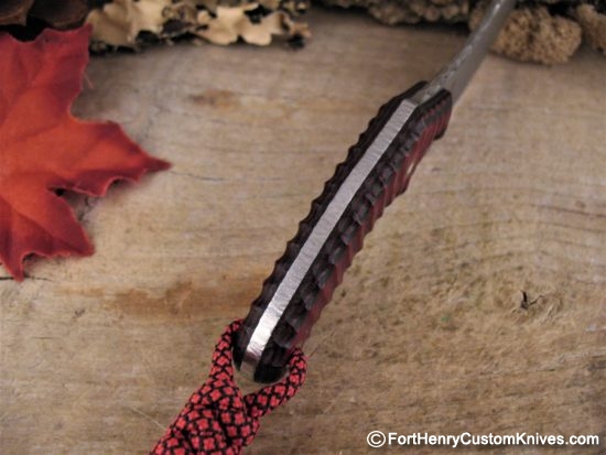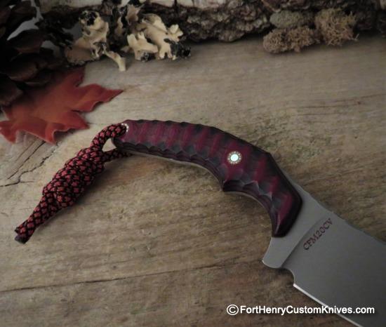 Thick Maroon & Black G-10 handle scales with Custom Texture with Traction Ridges around the Perimeter. This will provide a sure grip even under other than ideal conditions.