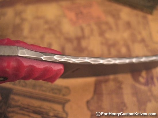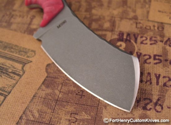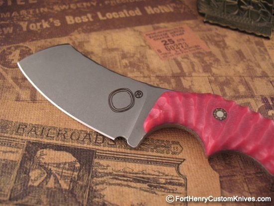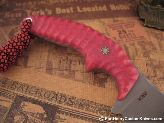 Thick Rose Colored G-10 handle scales with Custom Texture with Traction Ridges around the Perimeter along with a Single Custom Mosaic Pin.  This will provide a sure grip even under other than ideal conditions