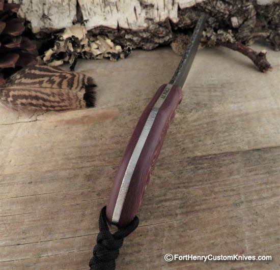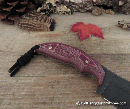 Uniquely Contoured handle scales on this Cobble Blade Geronimo feel Extremely Comfortable and Secure in the hand, the Deep Forward Finger groove keeps your hand in the right place. The Layered G-10 Handle Scales are set off by Custom Mosaic Pins and a Mosaic Lanyard Hole.