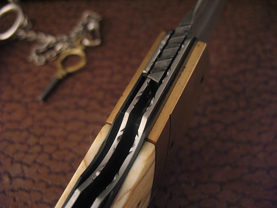 The Wharncliff blade was hand ground with a Long Custom Swedge from 1095 heat treated to form a beautiful Hamon.  The blade flips incredibly smoothly ~ no wrist action necessary.