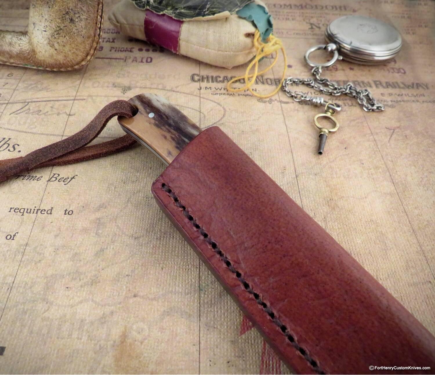 This knife is a small game Hunter called the Pocket Pal. It has beautiful Stabilized Giraffe Bone handles that have Rich color and are well matched and very well contoured.