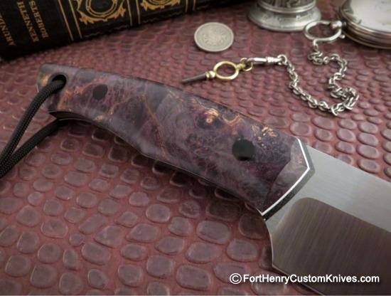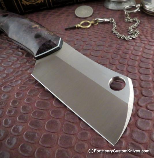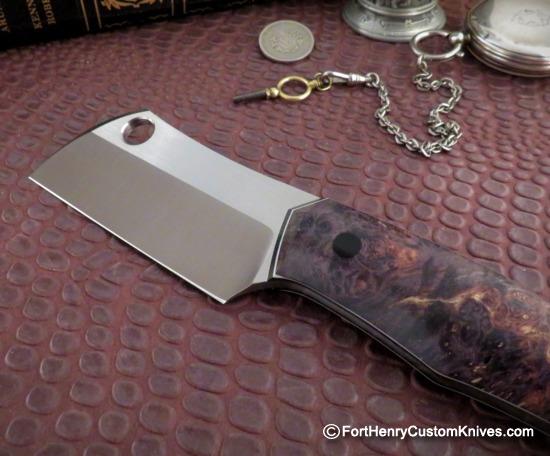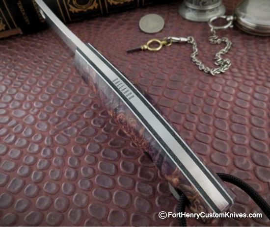 This Gallardo Pocket Cleaver was Hand Crafted with a very Comfortable, Full Grip Handle, the Handle Material is an incredible set of Stabilized and Highly Figured Maple Burl.  Joshua chose to set the handle material off with with Dramatic White G-10 and Black Liners.