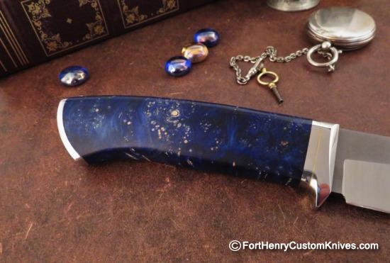 Here is a knife that embodies the true spirit of a Hand Made knife. Georgi Crafted the Handle using Gorgeous Dyed Stabilized Maple Burl that reminds me of a picture of Deep Space / Cosmic Galaxy. The Custom Stainless Steel Finger Guard is Mirror Polished with a Subtle Brass Spacer.