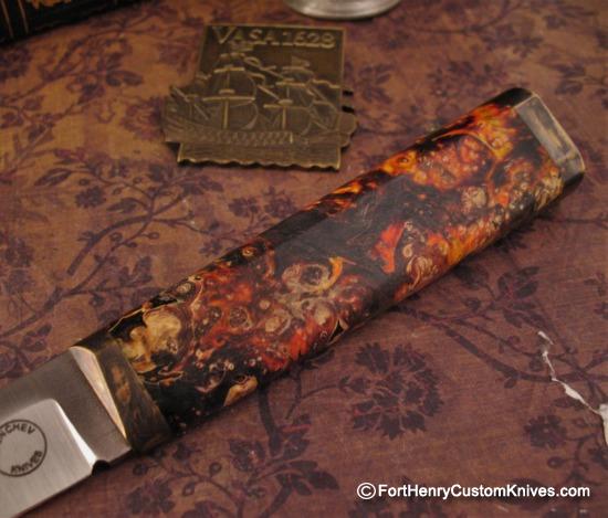 Here is a knife that embodies the true Spirit of a Bushcraft knife, a Traditional Scandinavian styled Puukko. Georgi Crafted this knife with a Gorgeous Stabilized Maple Burl handle with a very unique Tear Drop Shape.
