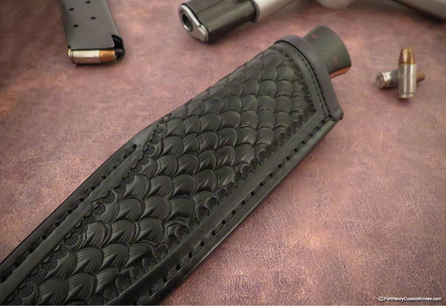 Complete with an Exquisite Paul Long Leather Belt Sheath.  Paul is a Master Saddle and Sheath Maker, he lines his amazing sheaths with Soft Leather to better protect the blade finish. (This Sheath is a $150 upgrade