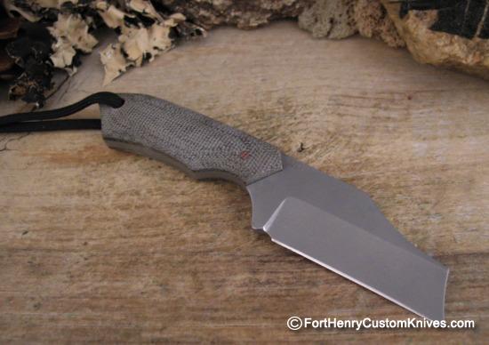 This design provides a Three Finger Grip of the Handle, but with the addition of a Paracord Lanyard it fills the remainder of the palm. The Blasted Canvas Micarta handle scales are Custom Contoured and have a Subtle Surface Texture.