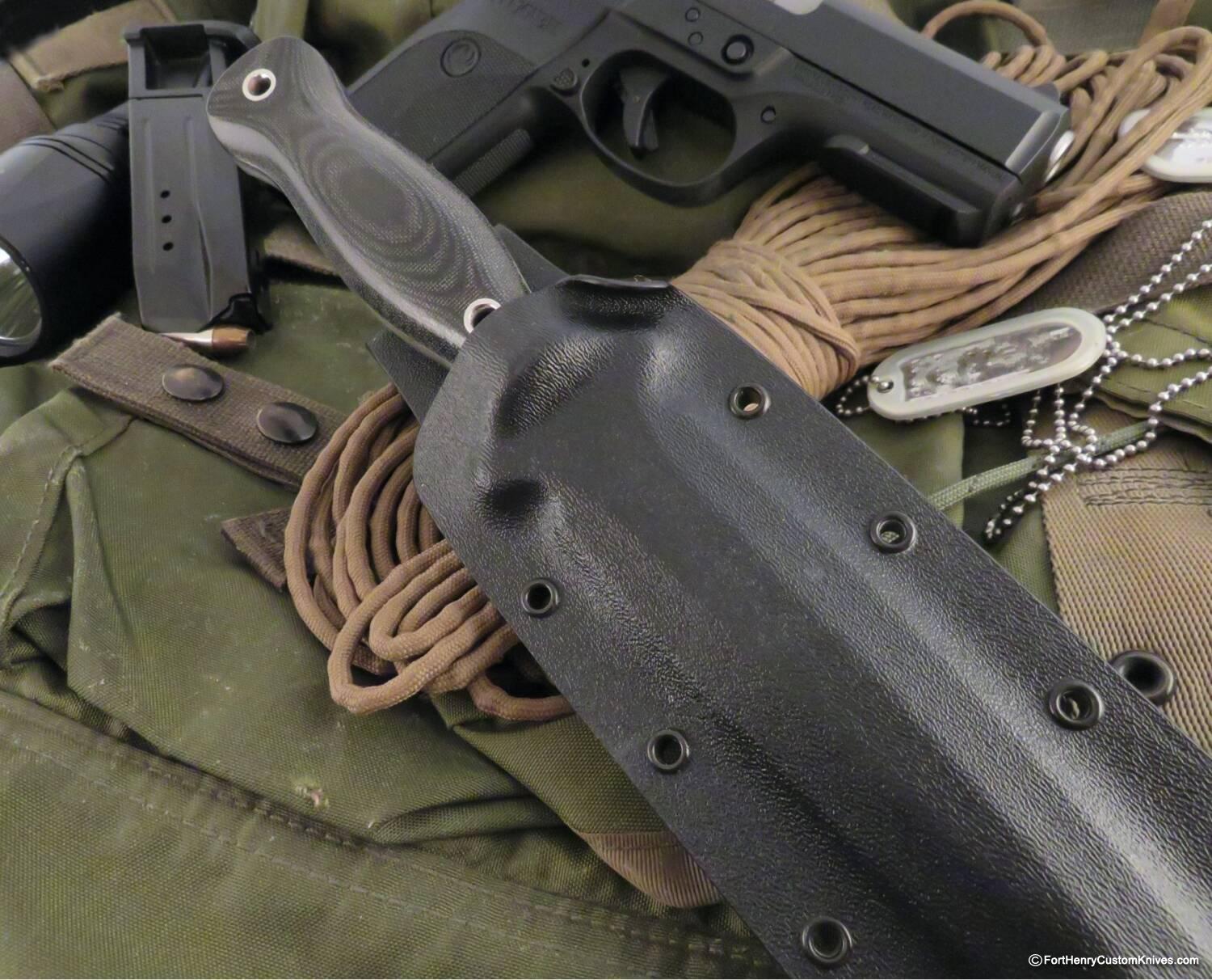 On this is model the double hollow ground Dagger blade makes the knife striking in appearance and singularly functional. The Generous Double Guard and the Contoured black micarta Scales make this feel very Comfortable and Secure in the hand.