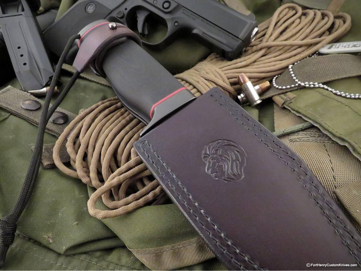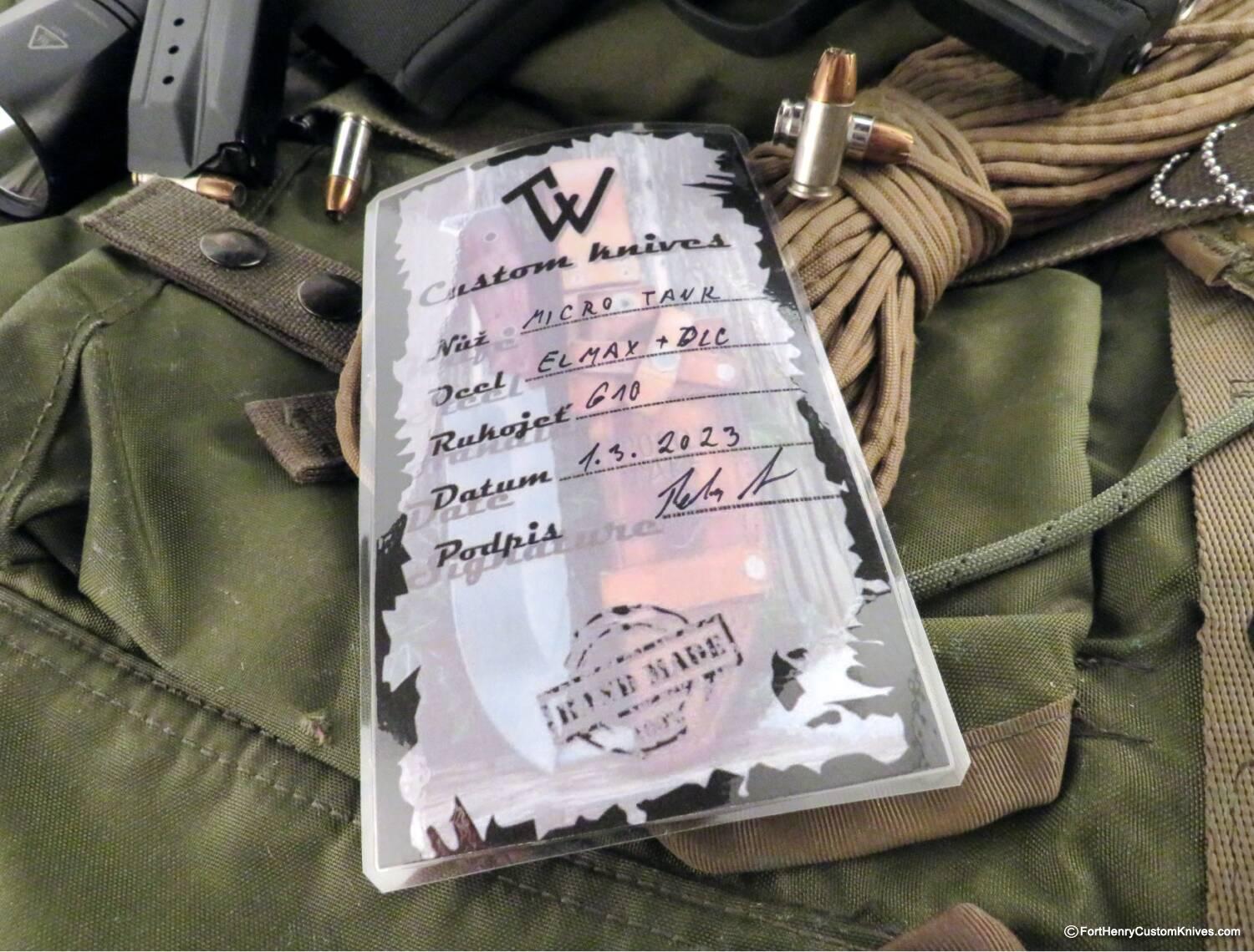 This PW Custom Micro Tank comes with a Secure, Custom Made Thick Leather sheath. Double Stitched, Thick Double Welting and Secondary Stretch Cordage on the Strap