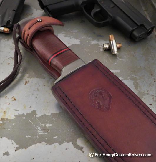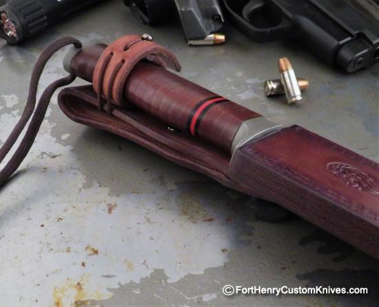 The Handle scales are Beautiful Stacked cowhide leather that has been impregnated with beeswax and polycarbonate for a resilient and long lasting life. Black and G-10 Red Spacers have been added for a pop of color. A Full Hidden Tang goes all the way through the handle. The Buttcap is Securely fitted with a Wide Stainless Blind Screw.