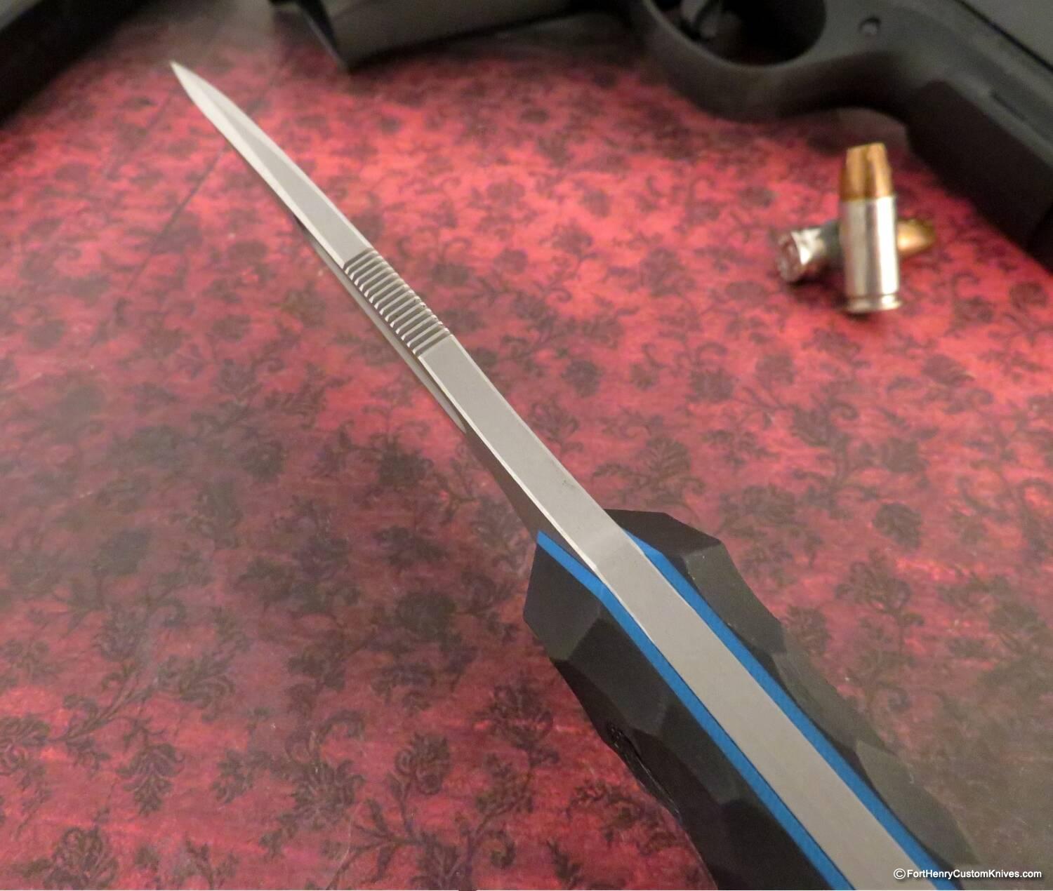 Custom Thumb Recess and Thumb Ridges on the Spine are in just right location to enhance the Grip of this Tough Blade. Thick Blue G-10 Liners help stabilize the handle scales.